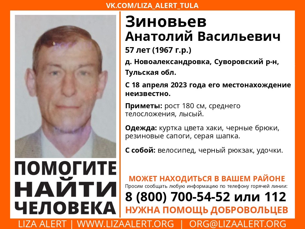 Пропал Зиновьев Анатолий Васильевич, 57 лет (1967 г.р.).