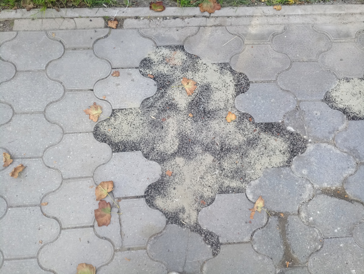 Заменить попавшую плитку другой сложно, так как нужно подбирать точно такую же по форме. Поэтому выбоины и заделывают асфальтом или бетоном. Это дает возможность сохранить единое дорожное полотно и не угрожать безопасности пешеходов.
