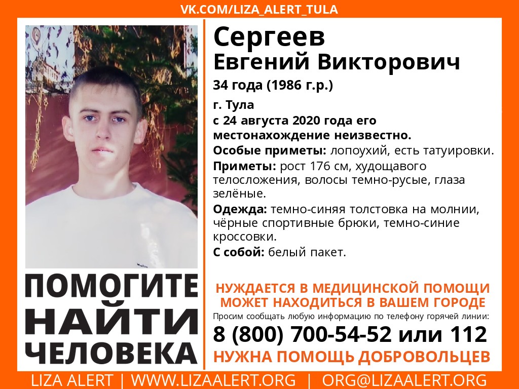 В Туле ищут пропавшего мужчину – 34-летнего Евгения Викторовича Сергеева. О его местонахождении ничего не известно с 24 августа.