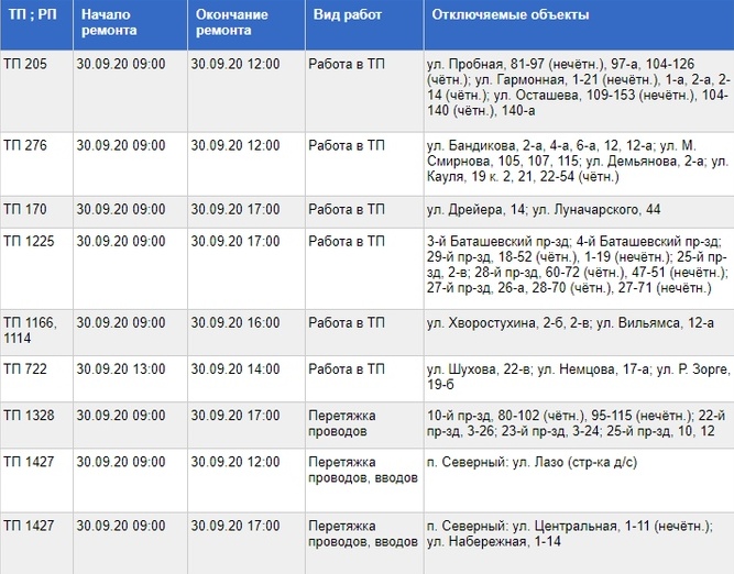 Ниже публикуем график проведения работ и адреса, по которым будет ограничена подача электроэнергии: