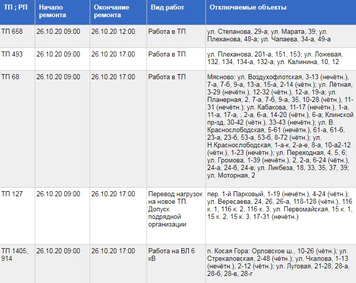 Публикуем график проведения работ и адреса, по которым будет ограничена подача электричества: