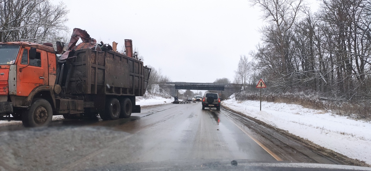 Под Тулой ломовоз «разгрузился» об эстакаду: движение на дороге затруднено