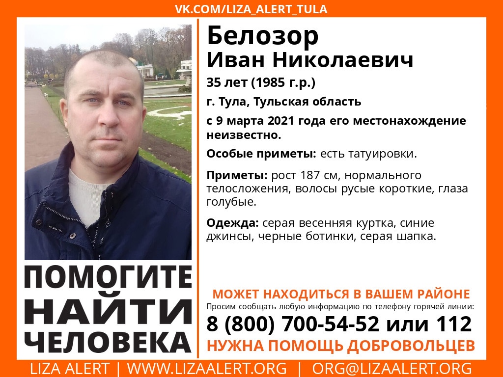 В Туле пропал 35-летний мужчина. Белозор Иван Николаевич 9 марта 2021 года ушел из дома. В настоящее время его местонахождение неизвестно.