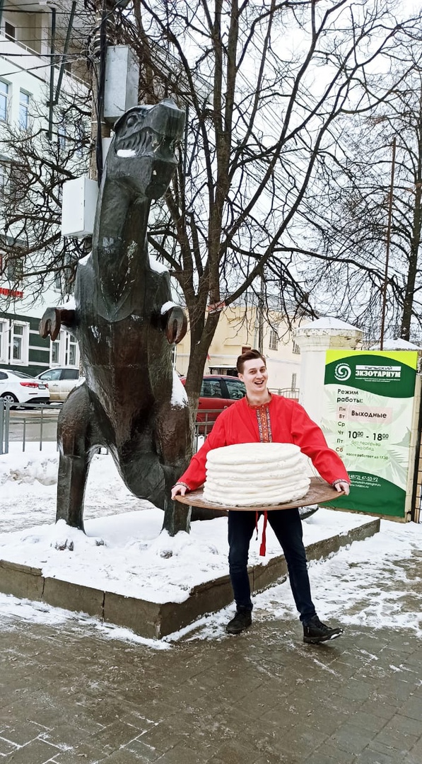 14 марта в честь Масленицы скульптуру динозавра у Тульского экзотариума украсила тарелка с блинами.