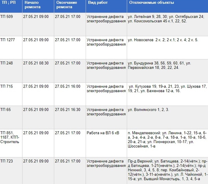 Публикуем график проведения работ и список адресов, по которым будет ограничено электроснабжение: