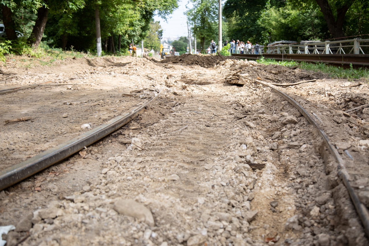 На участке почти 200 метров от улицы Михеева до улицы Кауля рабочие снимают старое покрытие и подготавливают площадку для укладки новых рельс и асфальта. Планируется, что первый трамвай проедет здесь к 1 сентября, а к концу месяца там поедут уже автобусы.