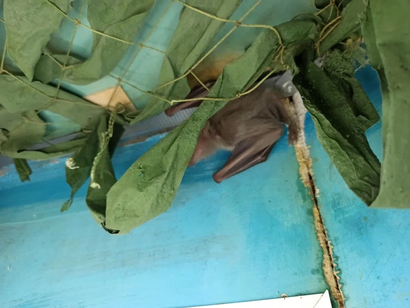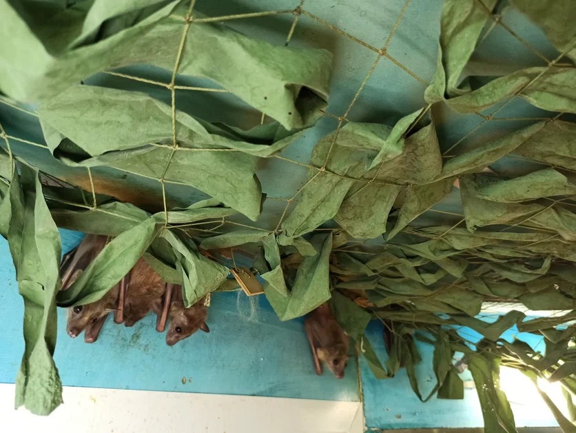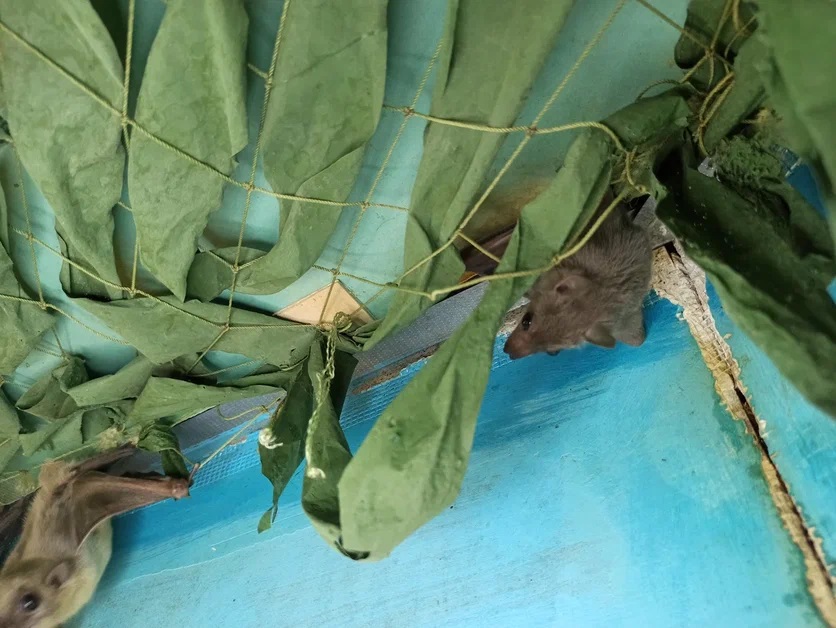Как только малыш стал самостоятельным, научился летать и добывать пищу, он вместе с мамой переехал к остальным членам семьи крыланов. Они все живут в одном вольере со шпороносной черепахой.