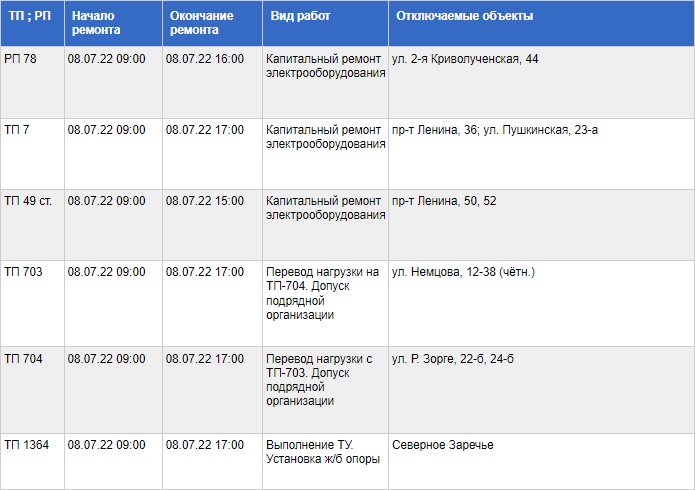 Публикуем график проведения работ и список адресов, жители которых на время останутся без электричества:
