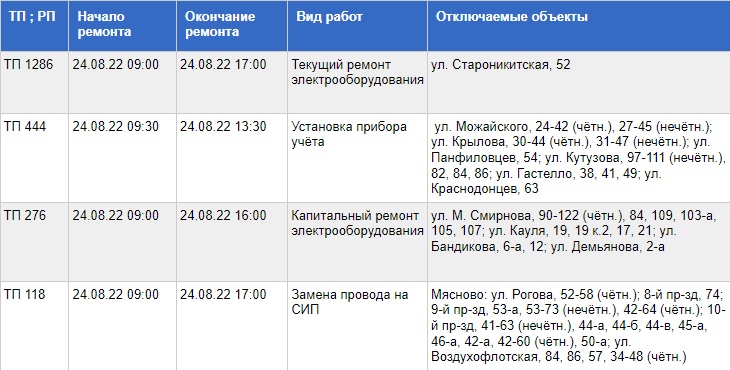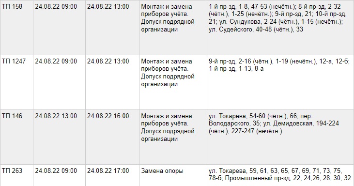 Публикуем график проведения работ и список адресов, жители которых на время останутся без электричества: