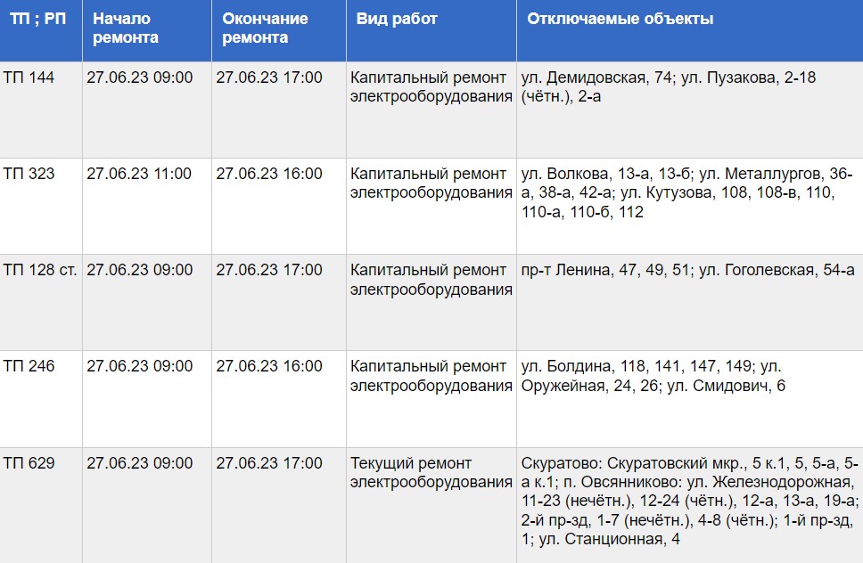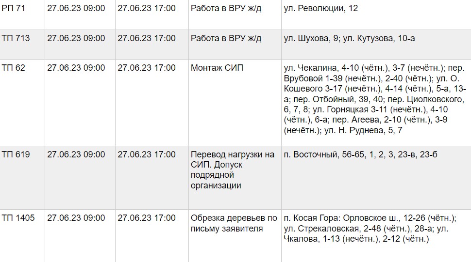 Публикуем график проведения работ и список адресов, по которым будет временно ограничена подача электричества: