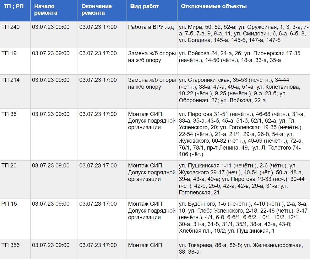 Публикуем график проведения работ и список адресов, по которым будет временно ограничена подача электричества: