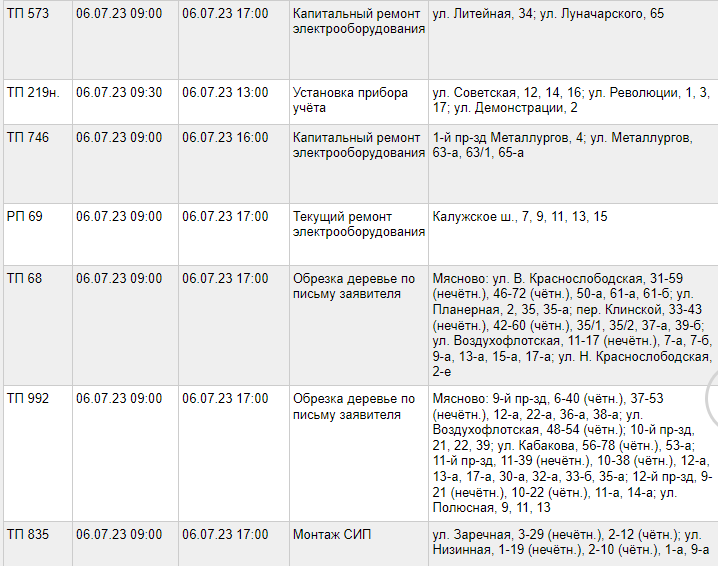 6 июля десятки домов в разных округах Тулы останутся без света