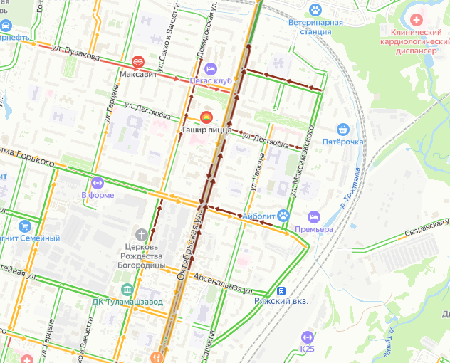 Судя по онлайн-картам, сейчас движение по улице Октябрьской в районе места ДТП затруднено. Участок окрашен в бордовый цвет.