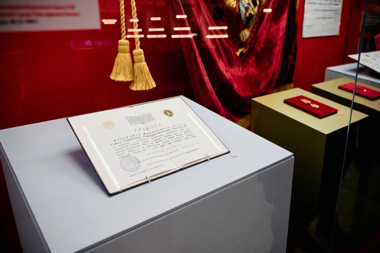 Центральный экспонат выставки - подлинная медаль "Золотая звезда". Городом-героем Тула стала 7 декабря 1976 года, а 18 января 1977 года в оружейную столицу приехал Леонид Брежнев, чтобы лично вручить медаль.