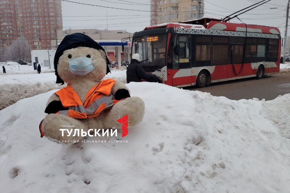 Игрушку усадили на сугроб напротив здания диспетчерской службы троллейбусной станции Южной. Косолапого нарядили в шапку, маску и даже миниатюрную ярко-оранжевую жилетку.